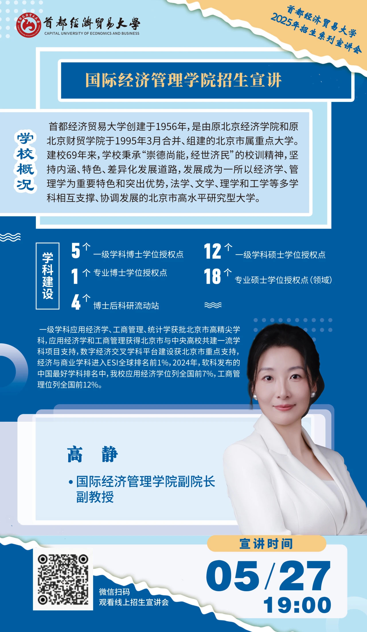 此外,学院积极响应学校教务处2025年招生宣传工作部署,通过线上线下相结合的方式开展了一系列卓有成效的宣传活动。线上方面,学院精心打造“学院专业早知道”微信视频号专题内容,参加首都经济贸易大学2025年线上高招直播宣讲(宣讲回放可扫描文末二维码观看),并推出60秒说专业短视频,以生动直观的方式展示专业特色。线下方面,学院组织专业教师团队先后赴北京中医药大学、北京化工大学、全国财经(商科)类高校在津高招咨询会以及北京市十一学校等地开展现场咨询活动。同时,学院还持续提供多渠道咨询服务,包括高招专属微信群答疑和教学办公室电话咨询,确保考生和家长能够及时获取权威信息。通过这些全方位、立体化的宣传活动,学院系统地介绍了学校和学院的办学优势、金融学专业特色及2025年本科招生政策,为考生志愿填报提供了专业指导。