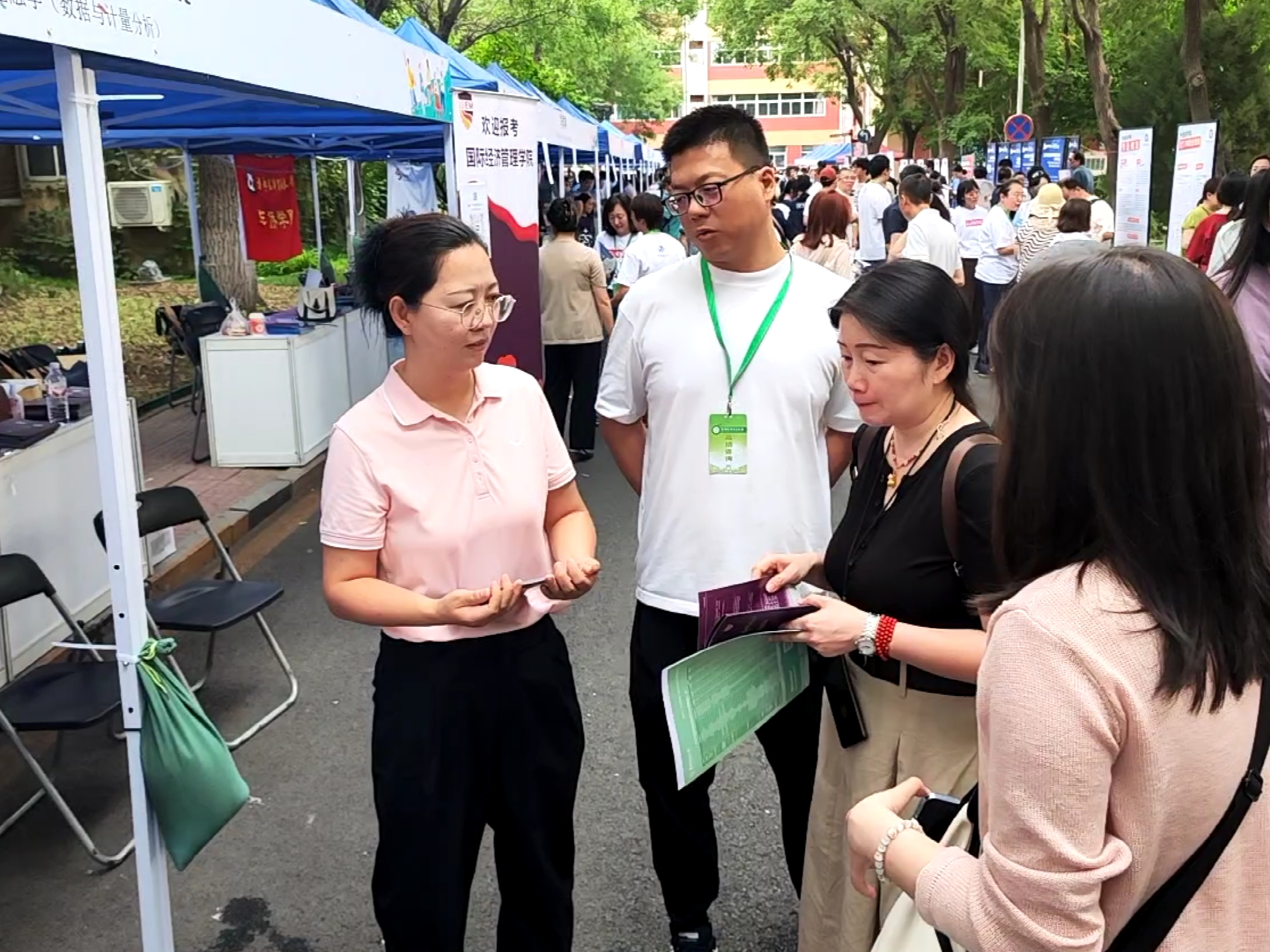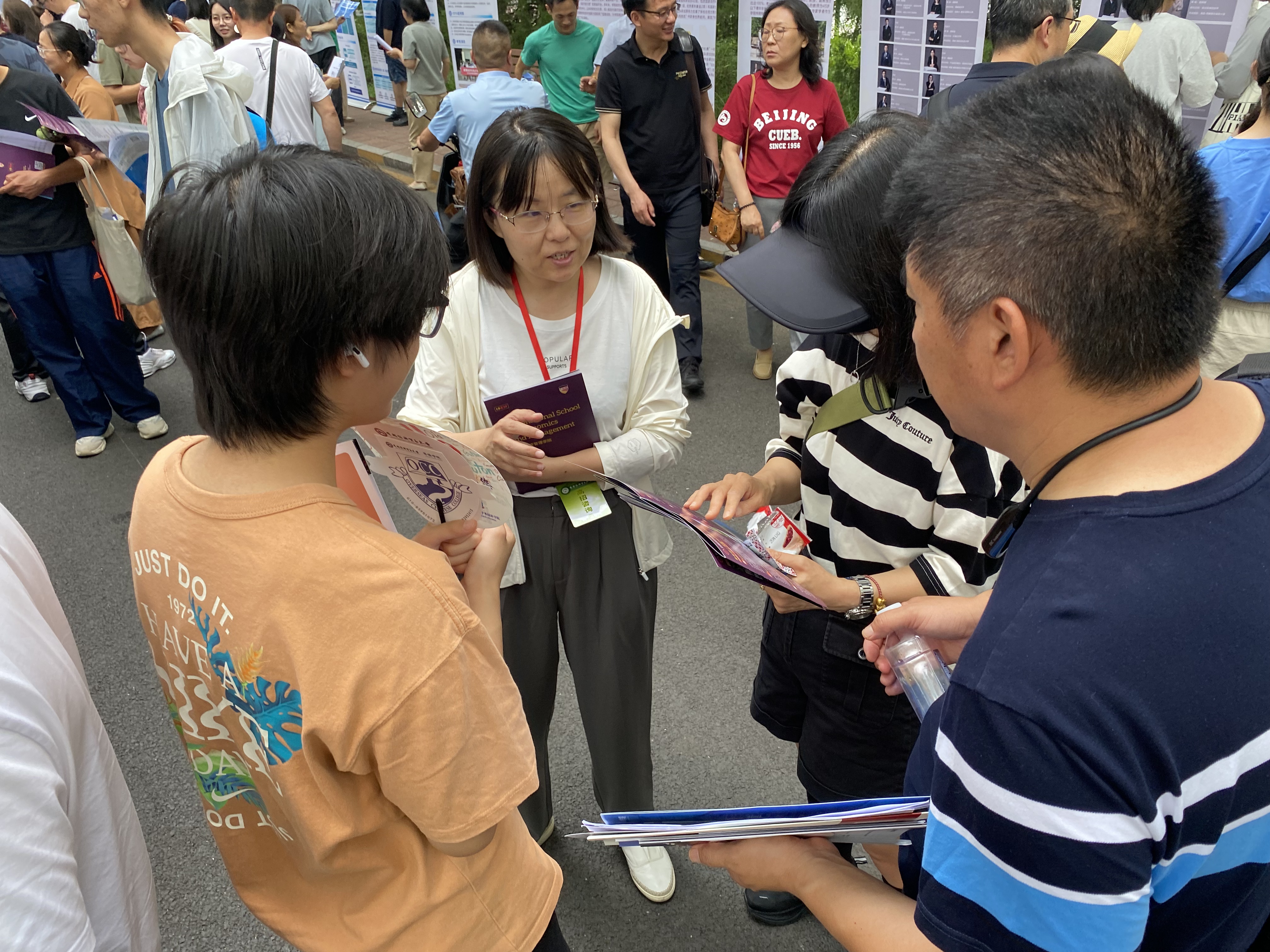 6月26日上午,国际经济管理学院在首都经济贸易大学校园开放日活动中,面向2025届高考考生及家长开展了本科招生现场咨询。学院党委书记姜蓓蓓、院长马庆寅、党委副书记付明岩、副院长高静、副院长李委明、金融系两位主任黄宗晔和庞蔡吉、团委书记张雅淇、教学秘书胡一晗以及在校学生代表共同参与了此次活动。