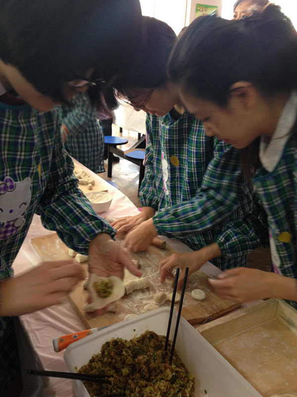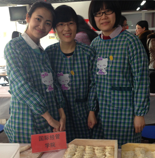 2014年校工会组织的三八妇女节包饺子比赛是国际经济管理学院分工会成立以来参加的第一个全校性活动。3月5日早上,学院的三名参赛队员苏志、王超、金湜在9点前到达比赛地点——第三食堂一楼,为比赛积极做准备工作。大家一到会场就把外套换下,把工会配发的围裙穿上。王超从家里带了擀面杖、擀面板和切面刀,可谓是万事俱备,只欠面团和饺子馅。安置好包饺子工具,三人开始商量分工,苏志负责切面块和包饺子,王超负责对体力、技术、速度要求较高的擀面工作,金湜负责把方形面块压成圆形面块和包饺子。当三位参赛队员在商量战术的时候,忽然发现学院的陶乾老师也来到了比赛现场,特地为她们加油助威来了!队员们很受鼓舞! 当比赛开始的时候,三位队员按照既定战术有条不紊的开展工作。只见王超滚起擀面杖,一块块厚薄适中的饺子皮在她手中迅速成型;金湜和苏志拿起饺子皮放入比赛特制的饺子馅,一刻也不懈怠的包起饺子,为了使饺子美观,她们还认真的捏起饺子褶。陶乾在一旁给参赛队员加油助威,并帮忙数包好的饺子,不停的给她们报数。可是很快,队员们发现自己包饺子的速度落后于其他队伍,于是马上调整战术,开始包小饺子同时减少褶饺子工序。几分钟内,包好的饺子数量迅速增加,陶乾不停的倒数,还差10个,8个,6个….!终于,100个既美观又薄皮大馅的饺子包好了!大家马上举手示意裁判检查。 虽然这次比赛学院没有拿到任何奖项,但是在场的工会成员都很开心,重在参与,包个饺子庆节日!