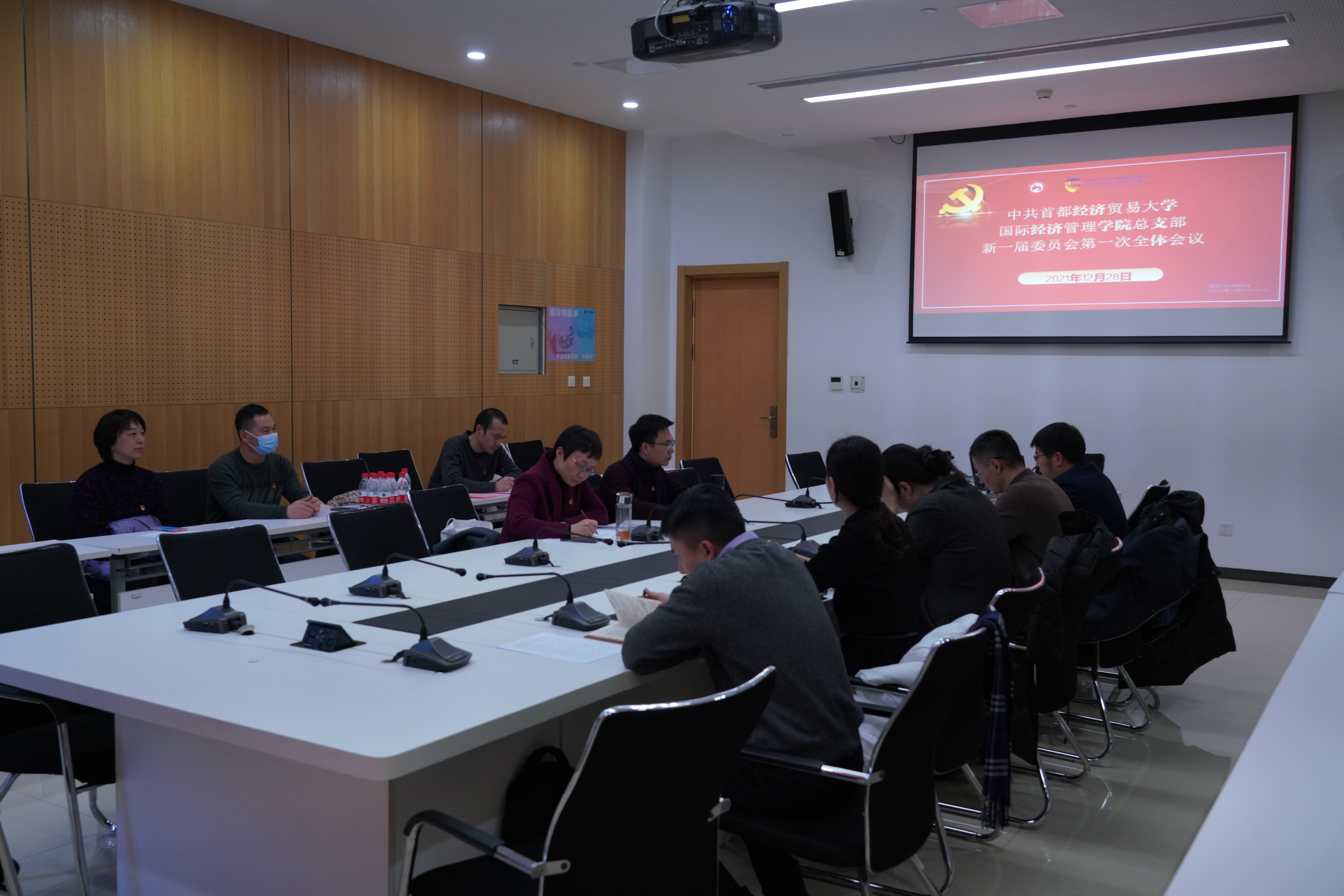 新一届党总支委员会于党员大会后,召开第一次全体会议。会议通过总支部委员会第一次全体会议选举办法,选举书记、副书记,并对新一届党总支委员进行分工。通过选举,曾庆梅当选国际经济管理学院党总支书记兼统战委员,李鲲鹏、于滨滨当国际经济管理学院党总支副书记,李鲲鹏兼任保密保卫委员,于滨滨兼任宣传委员,高静担任纪检委员,李委明担任组织委员,金湜担任青年委员,牛毅担任保密保卫委员。