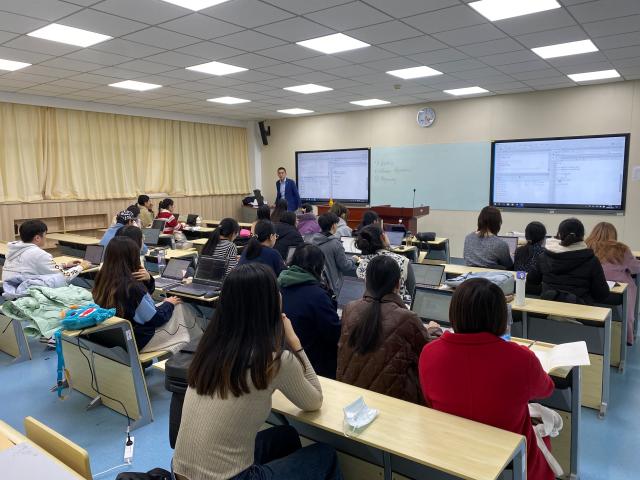 王钛宁老师首先利用R的免费下载与快速安装操作向大家展示了R软件强大的便捷性。随后通过配套软件Rstudio详细介绍了R界面以及基础操作。随后的课程里,王老师一步步带领同学们学习了对集合或者矩阵的基本计算法则,以及数据的生成、归纳和画图,回归方程的使用方法和注意事项。此外,王老师还介绍了关于基础编程的逻辑和实际应用。王老师在讲解每一个例子时还同时强调在初始学习R语言时容易出现的错误句法。课堂现场气氛活跃,同学们认真边听课边实操,并在课后同老师进行了提问和积极讨论。