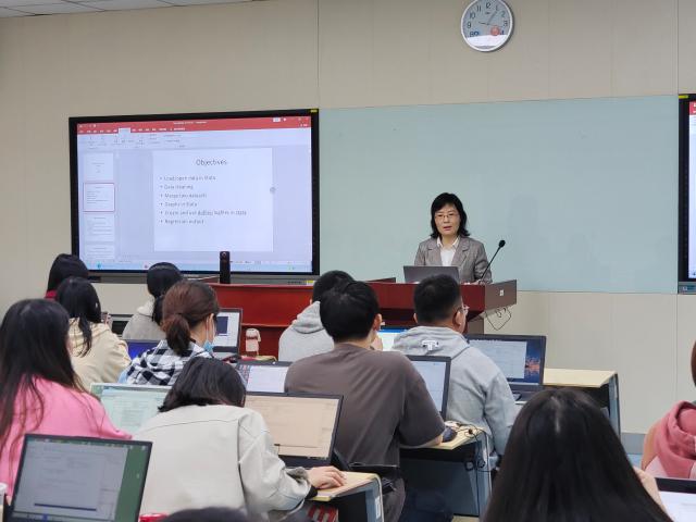 为夯实国际经济管理学院本科及研究生科研软件应用基础,学院于2021年10月14日,在慎思楼120智慧教室开设STATA软件操作培训班。培训课程由副教授王超老师主讲,国际经济管理学院共43名本科及研究生参加。本次课程由学院院长助理李委明主持。