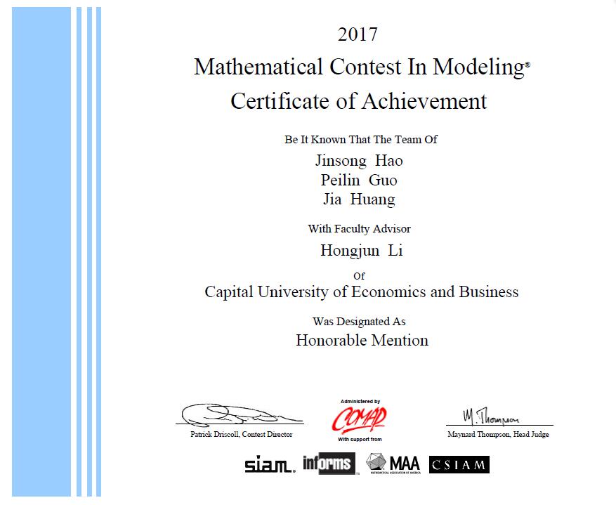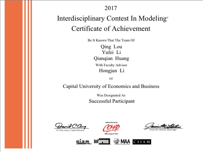 近日2017年美国大学生数学建模竞赛(MCM/ICM)成绩正式公布。我院共有五组同学成功参加了竞赛。在我院李红军、林蔚、杨欣桐三位老师的指导下,国际经济管理学院参赛同学在此次竞赛中取得了优异的成绩。1个小组获得了Meritorious Winner奖项,2个小组获得了Honorable Mention奖项,2个小组获得了Successful Participant奖项。