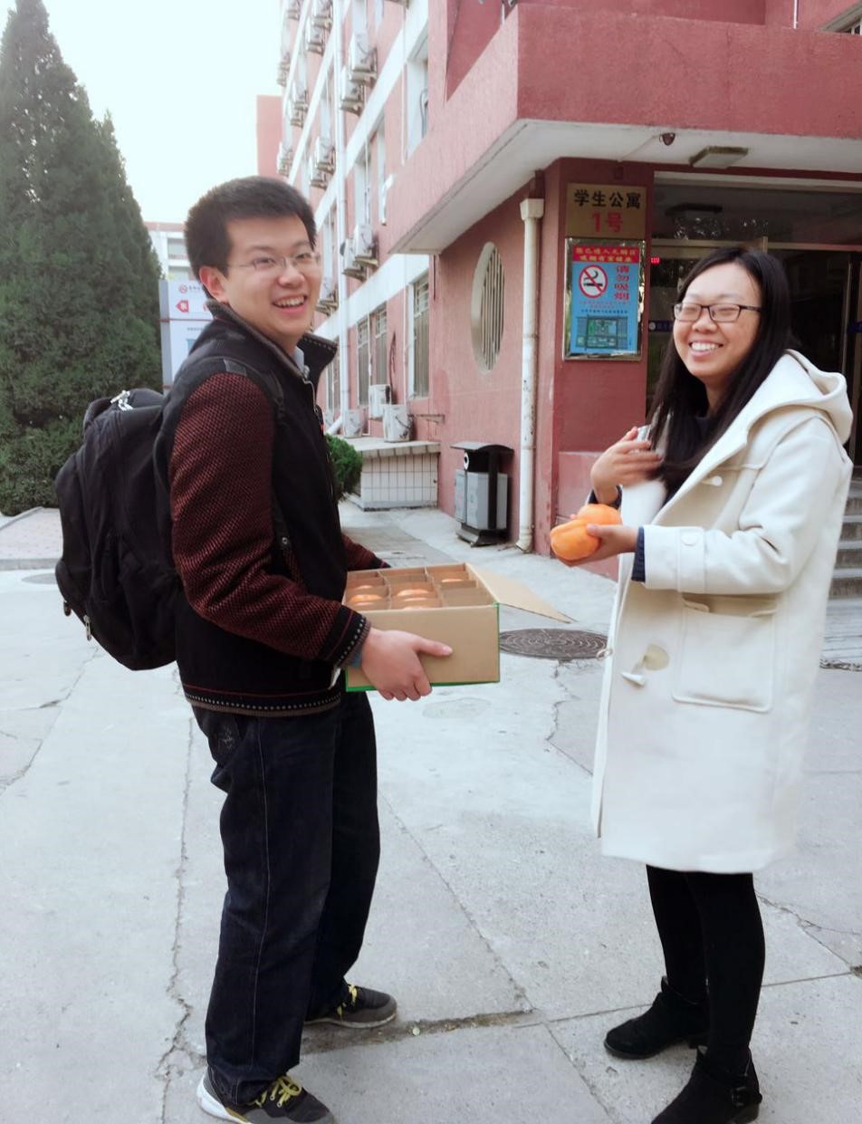 “幽姿不入少年场。无语只凄凉。一个飘零身世,十分冷淡心肠。” 11月11日俗称光棍节,加之同学们经历了三门期中考试的洗礼,孑然一身,孤独与凄凉。本周五,国际经济管理学院李劭琛师兄和夏晓佳师姐代表学院和研会给研一同学们带去了来自学院的中期慰问。 这次的慰问品是两箱柿子,秋冬吃柿子可以清热止血,中医有云柿霜润肺,多吃柿子也有助于对抗雾霾。师兄师姐把柿子送到了宿舍,并关切的询问了同学们的学习和生活情况。大家表示虽然柿子是凉性水果,但握在手里,竟感受到浓浓的温暖。