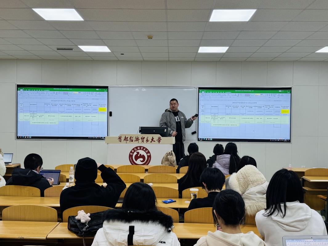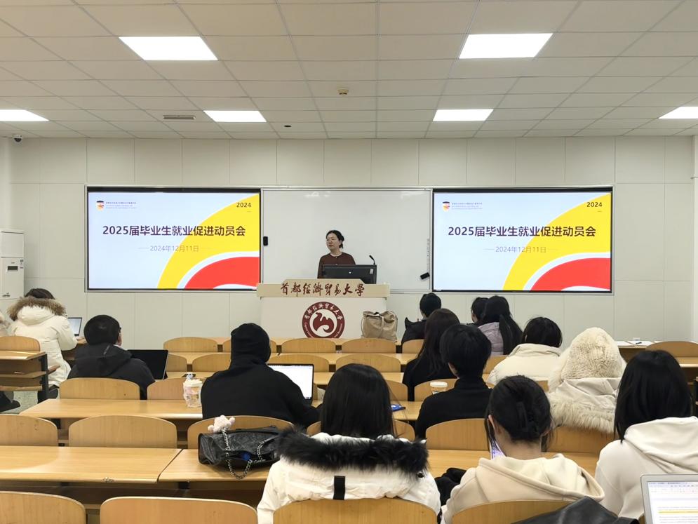 2024年12月11日,国际经济管理学院2025届毕业生就业促进动员会在慎思楼312教室顺利召开。学院党总支副书记付明岩、本科教学秘书胡一晗、兼职辅导员孟宛昕及全体2025届毕业生参加会议。