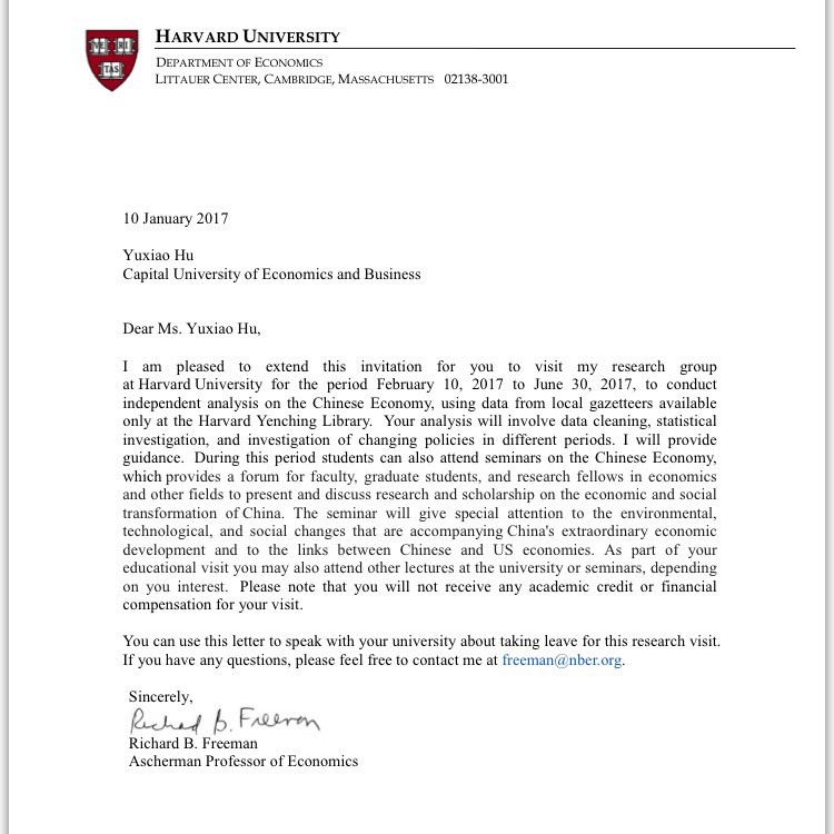 2017年春季新学期开始,首都经济贸易大学国际经济管理学院2015级研究生胡雨霄同学受世界著名经济学家Richard B. Freeman邀请,前往美国哈佛大学从事为期长达半年的学术研究,与哈佛大学的学者们共同在国民经济研究所(National Bureau of Economic Research)研究中国经济问题。国际经管学院为鼓励胡雨霄同学安心从事学术研究,为她在研究、生活经费等方面提供资助和支持。
