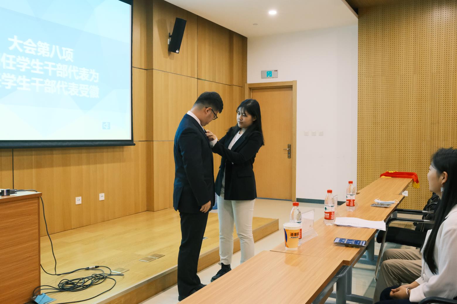 大会第四项,第六届学生干部代表蒋汝艺为新任干部授徽,标志着国际经济管理学院学生组织揭开了崭新的一页。